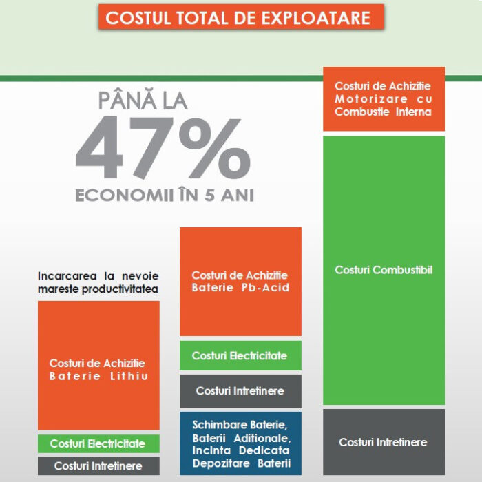 Costuri reduse cu combustibil – Bateriile cu Lithiu-Ion costa mai putin in timp decat bateriile cu Pb-Acid, sau decat motorizarea cu combustie interna pe GPL si motorina, iar costurile cu energia sunt mai previzibile.